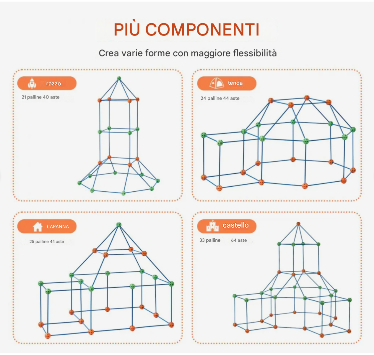 🎨 Creatività senza confini : 120 pezzi tra 80 aste e 40 palline ti permettono di costruire forti, tunnel, tende, piramidi e tanto altro, stimolando l'immaginazione dei più piccoli. 🧠 Giochi intelligenti per crescere : pensato come giocattolo STEM per bambini di 4 anni in su, aiuta lo sviluppo spaziale, la risoluzione dei problemi e la motricità fine.