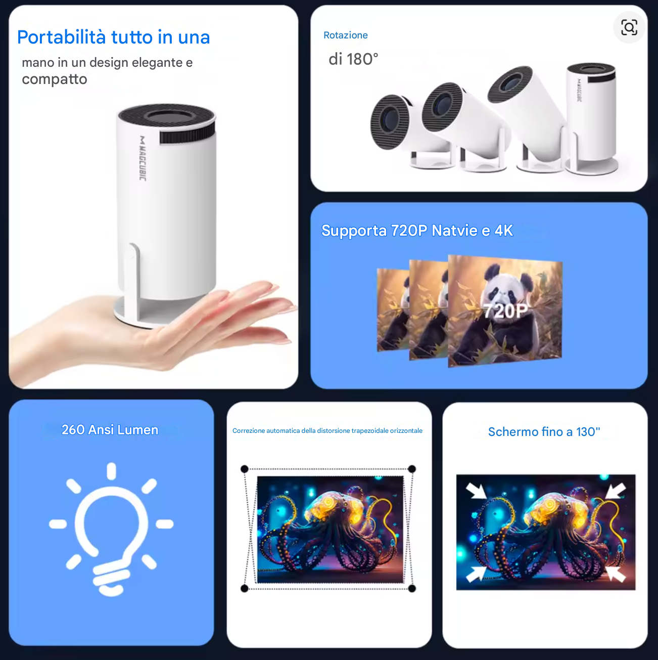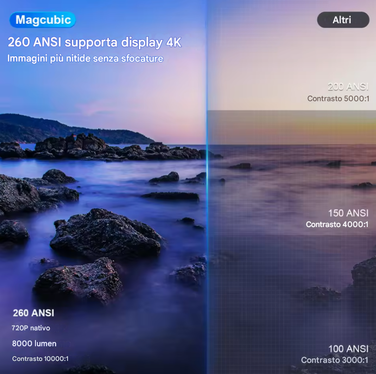 Immagine nitida, colori vivi e facilissimo da usare. Lo uso sia per guardare film la sera che per giocare alla Play. La correzione automatica fa tutto da sola: lo appoggi ovunque e l’immagine si sistema in pochi secondi. Veramente soddisfatto, sembra di avere un cinema in camera.